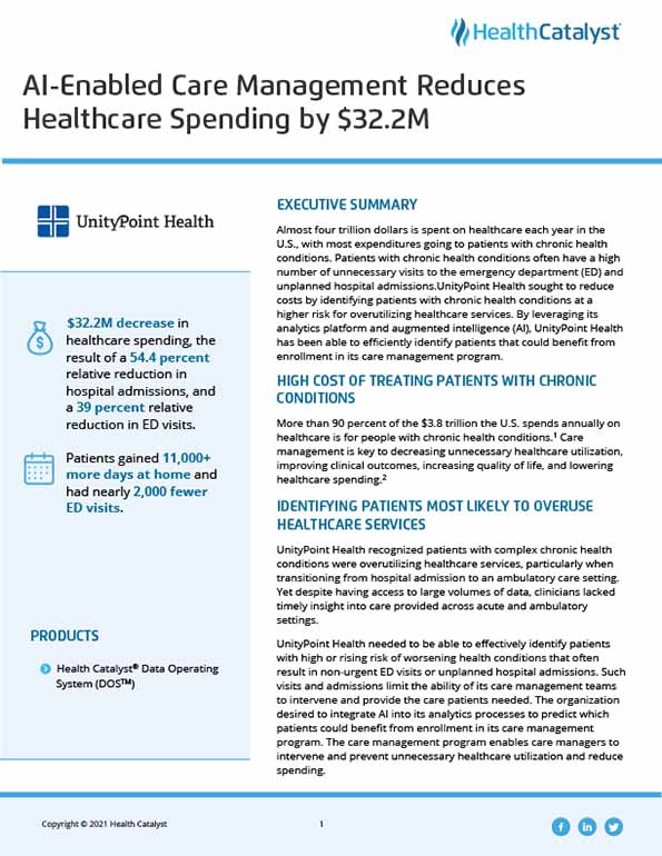 Almost four trillion dollars is spent on healthcare each year in the U.S., with most expenditures going to patients with chronic health conditions. Patients with chronic health conditions have a high rate of unnecessary visits to the emergency department (ED) and unplanned hospital admissions. UnityPoint Health sought to reduce costs by identifying patients with chronic health conditions at a higher risk for overutilizing healthcare services. By leveraging its analytics platform and augmented intelligence (AI), UnityPoint Health has been able to efficiently identify patients that could benefit from enrollment in its care management program.