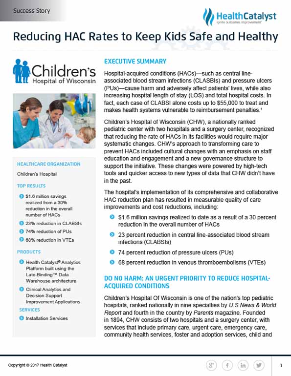 Children’s Hospital of Wisconsin (CHW), a nationally ranked pediatric center with two hospitals and a surgery center, recognized that reducing the rate of HACs in its facilities would require major systematic changes. CHW’s approach to transforming care to prevent HACs included cultural changes with an emphasis on staff education and engagement and a new governance structure to support the initiative. These changes were powered by high-tech tools and quicker access to new types of data that CHW didn’t have in the past.