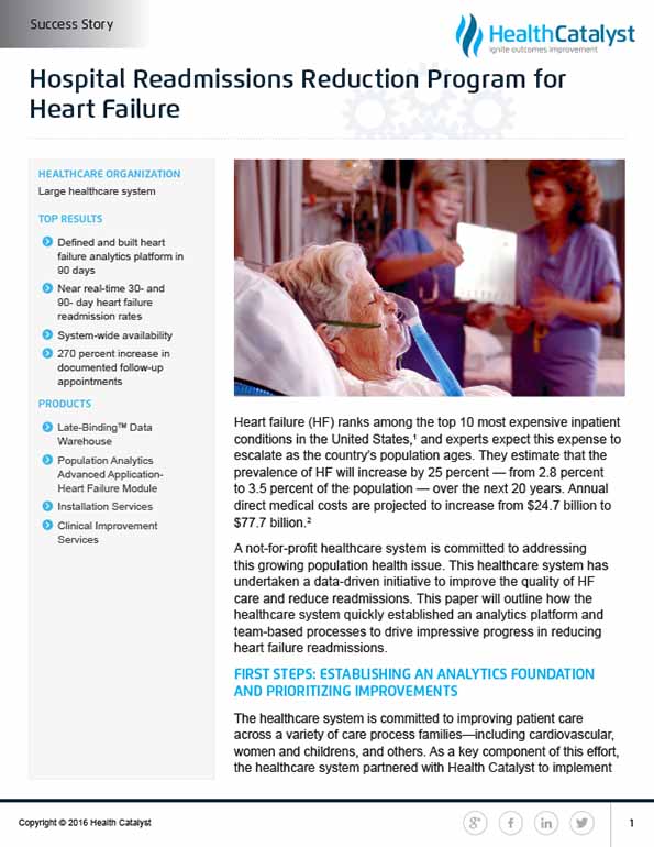 A not-for-profit healthcare system is committed to addressing this growing population health issue. This healthcare system has undertaken a data-driven initiative to improve the quality of HF care and reduce readmissions. This paper will outline how the healthcare system quickly established an analytics platform and team-based processes to drive impressive progress in reducing heart failure readmissions.