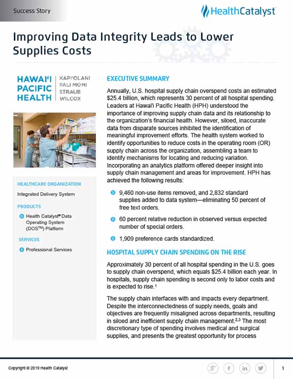 Using the Health Catalyst® Data Operating System (DOS™) platform and a robust suite of analytics applications, HPH gained insight into supply chain management. The analytics platform integrates data from HPH’s EMR and multiple supply chain systems.
