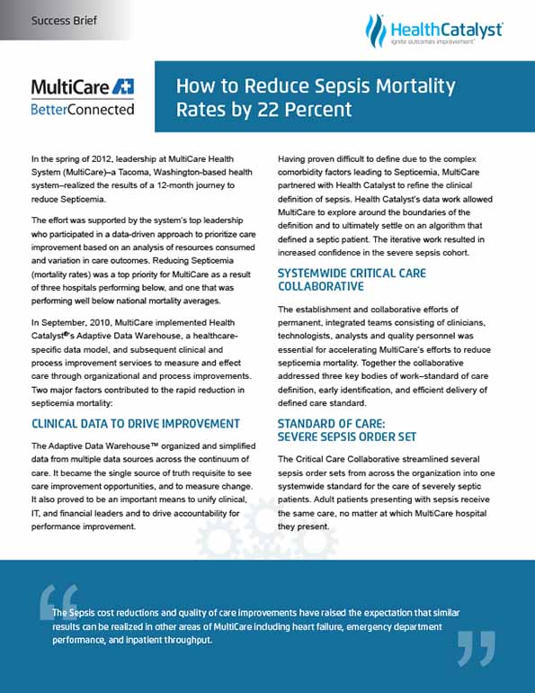 In September, 2010, MultiCare implemented Health Catalyst’s Adaptive Data Warehouse, a healthcare-specific data model, and subsequent clinical and process improvement services to measure and effect care through organizational and process improvements. Two major factors contributed to the rapid reduction in septicemia mortality:
