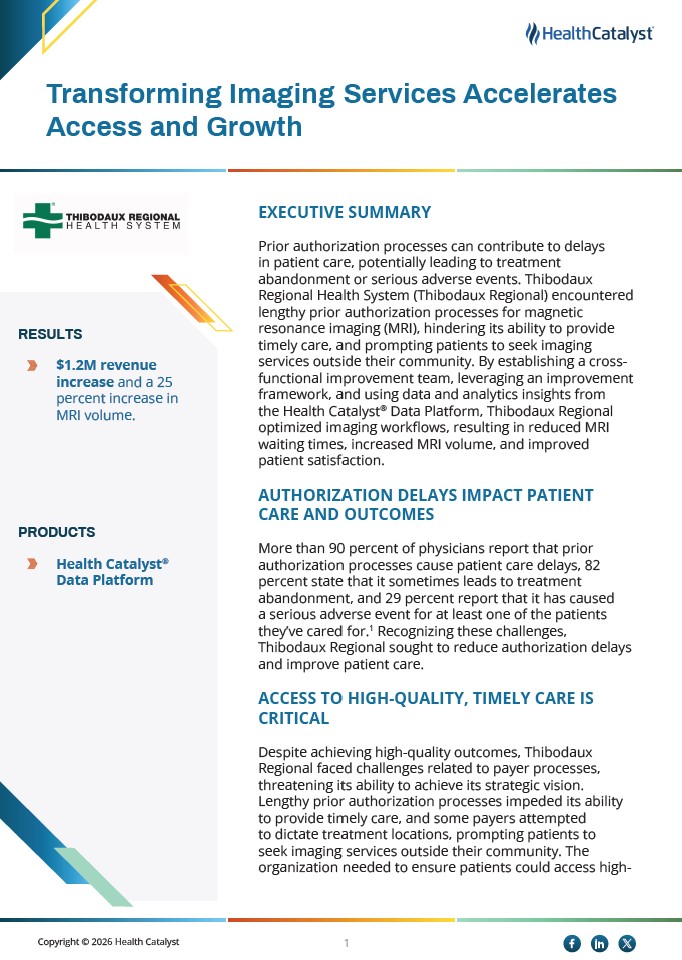 Prior authorization processes can contribute to delays in patient care, potentially leading to treatment abandonment or serious adverse events. Thibodaux Regional Health System (Thibodaux Regional) encountered lengthy prior authorization processes for magnetic resonance imaging (MRI), hindering its ability to provide timely care, and prompting patients to seek imaging services outside their community. By establishing a cross-functional improvement team, leveraging an improvement framework, and using data and analytics insights from the Health Catalyst® Data Platform, Thibodaux Regional optimized imaging workflows, resulting in reduced MRI waiting times, increased MRI volume, and improved patient satisfaction.