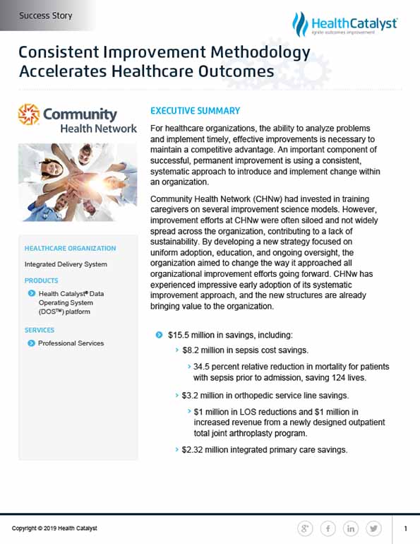 CHNw leadership established a vision for quality, aiming to deliver an exceptional experience to every life it touches. The organization describes quality as defined by its individual patients, based upon outcomes, experience, cost, and the appropriateness of care. CHNw partnered with Health Catalyst, implementing improvement functions in three systems to achieve systematic, organization-wide change.