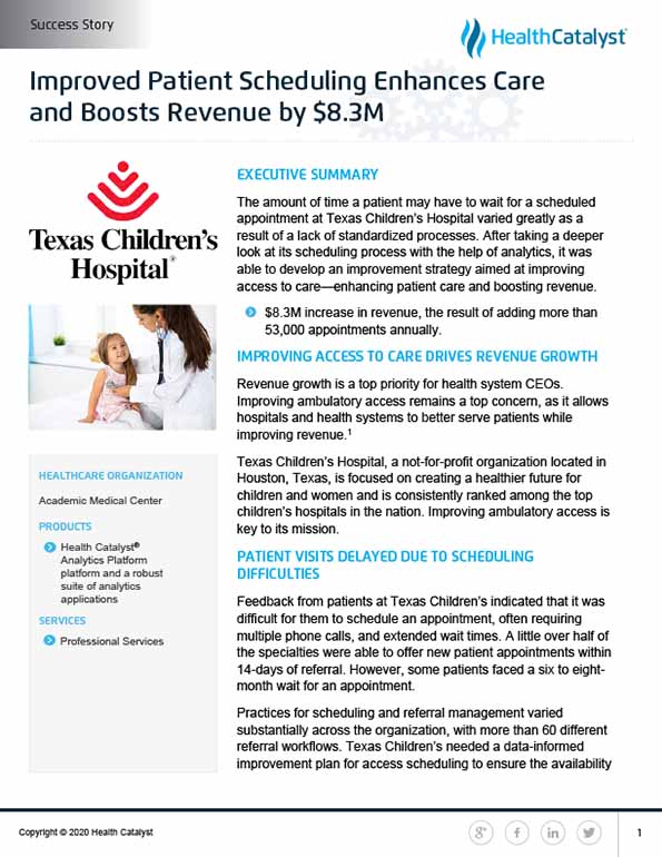 The amount of time a patient may have to wait for a scheduled appointment at Texas Children’s Hospital varied greatly as a result of a lack of standardized processes. After taking a deeper look at its scheduling process with the help of analytics, it was able to develop an improvement strategy aimed at improving access to care—enhancing patient care and boosting revenue.