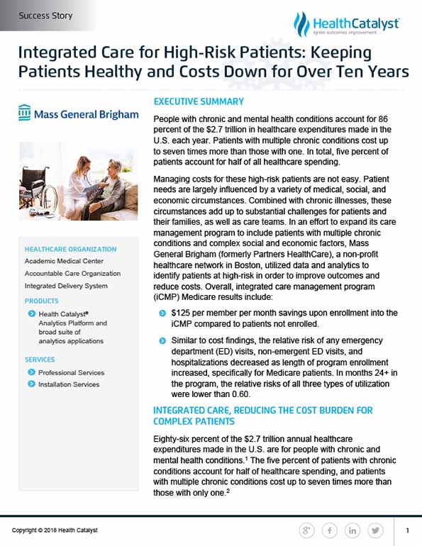 Managing costs for these high-risk patients are not easy. Patient needs are largely influenced by a variety of medical, social, and economic circumstances. Combined with chronic illnesses, these circumstances add up to substantial challenges for patients and their families, as well as care teams. In an effort to expand its care management program to include patients with multiple chronic conditions and complex social and economic factors, Mass General Brigham (formerly Partners HealthCare), a non-profit healthcare network in Boston, utilized data and analytics to identify patients at high-risk in order to improve outcomes and reduce costs. Overall, integrated care management program (iCMP) Medicare results include:
