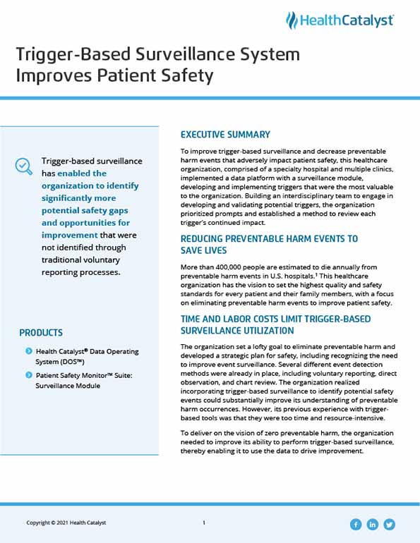 To improve trigger-based surveillance, the organization implemented the Health Catalyst® Data Operating System (DOS™) and a robust suite of analytics applications, including the Patient Safety Monitor™ Suite: Surveillance Module, partnering with Health Catalyst to develop and implement triggers that were most valuable to the organization.