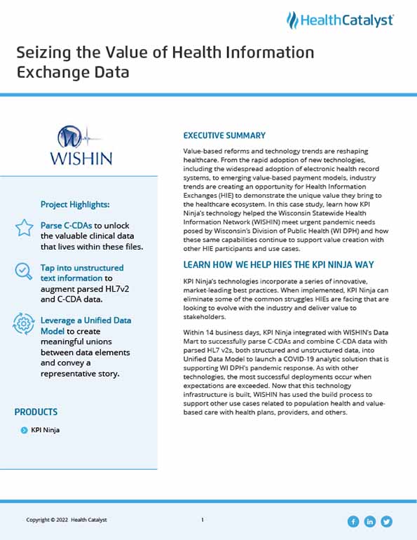 Value-based reforms and technology trends are reshaping healthcare. From the rapid adoption of new technologies, including the widespread adoption of electronic health record systems, to emerging value-based payment models, industry trends are creating an opportunity for Health Information Exchanges (HIE) to demonstrate the unique value they bring to the healthcare ecosystem. In this case study, learn how KPI Ninja’s technology helped the Wisconsin Statewide Health Information Network (WISHIN) meet urgent pandemic needs posed by Wisconsin’s Division of Public Health (WI DPH) and how these same capabilities continue to support value creation with other HIE participants and use cases.