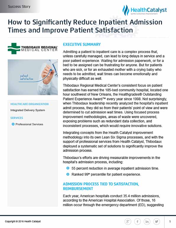 Integrating concepts from the Health Catalyst improvement methodology into its own Lean Six Sigma processes, and with the support of professional services from Health Catalyst, Thibodaux deployed a systematic set of solutions to significantly improve the admission process.