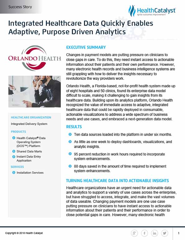 Orlando Health, one of Florida’s most comprehensive private, not-for-profit healthcare networks consisting of eight hospitals and 50 clinics, began its journey to making actionable data available across the organization when it made the transition from a legacy data warehouse solution to the Health Catalyst analytics platform, and subsequently to the Health Catalyst® Data Operating System (DOS™) platform.