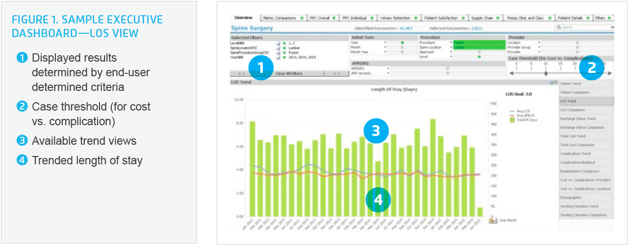 The Spine Program also continuously monitors clinical and patient satisfaction outcomes throughout the care delivery continuum— including patients cared for at independent physician clinics, Allina’s Hospitals and the Twin Cities Spine Center. Great attention is directed toward increasing patients’ quality of life, including their functional abilities as well as lowering perceived pain levels. To that end, Allina deployed a Spine Advanced Application. This is an analytics solution that monitors and manages LOS, readmissions, and provider preventable conditions (see Figures 1-3).