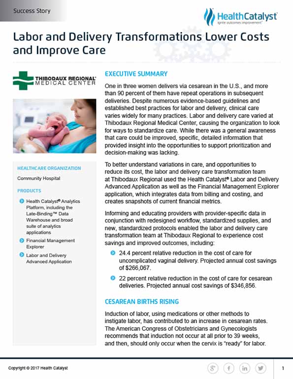 Thibodaux Regional Medical Center sought to reduce care variation and standardize labor and delivery care. Utilizing Health Catalyst solutions, the care transformation team analyzed data to identify improvement opportunities. Enhanced provider education, redesigned workflows, and standardized protocols resulted in cost savings and improved patient outcomes.