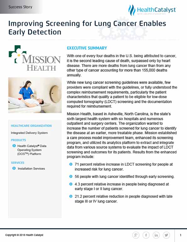 Mission uses the Health Catalyst® Data Operating System (DOS™) Platform to extract and integrate data from various source systems and gather them into the data warehouse. The organization uses the analytics platform to evaluate the impact of LDCT screening and outcomes for its patients.