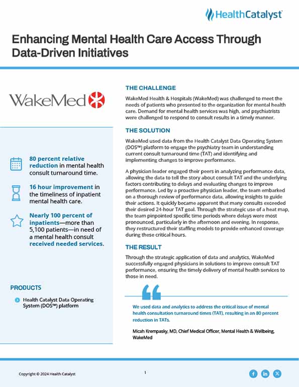 WakeMed used data from the Health Catalyst Data Operating System (DOS™) platform to engage the psychiatry team in understanding current consult turnaround time (TAT) and identifying and implementing changes to improve performance.