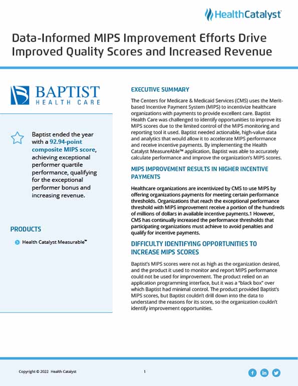 The Centers for Medicare & Medicaid Services (CMS) uses the Merit-based Incentive Payment System (MIPS) to incentivize healthcare organizations with payments to provide excellent care. Baptist Health Care was challenged to identify opportunities to improve its MIPS scores due to the limited control of the MIPS monitoring and reporting tool it used. Baptist needed actionable, high-value data and analytics that would allow it to accelerate MIPS performance and receive incentive payments. By implementing the Health Catalyst MeasureAble™ application, Baptist was able to accurately calculate performance and improve the organization’s MIPS scores.
