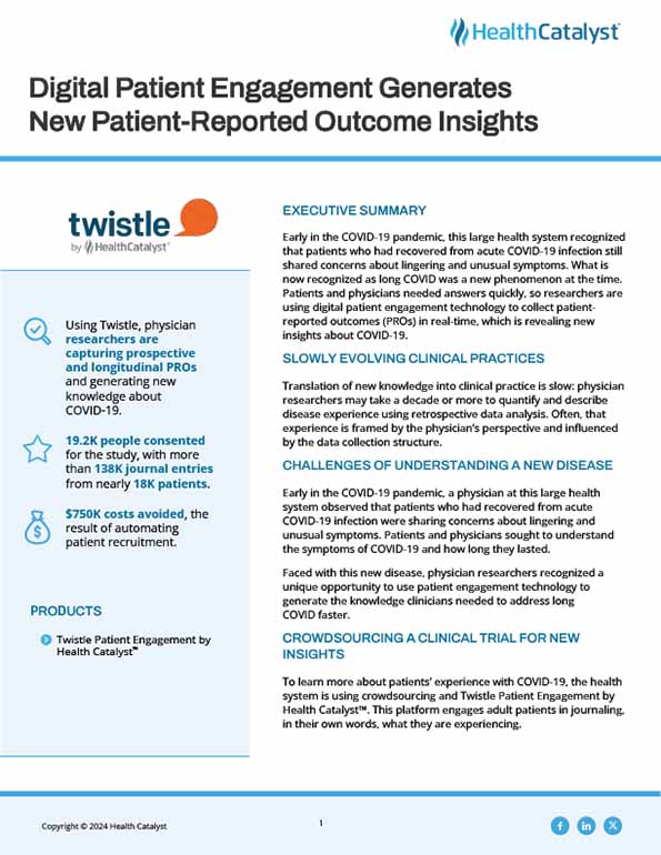 To learn more about patients’ experience with COVID-19, the health system is using crowdsourcing and Twistle Patient Engagement by Health Catalyst™. This platform engages adult patients in journaling, in their own words, what they are experiencing.