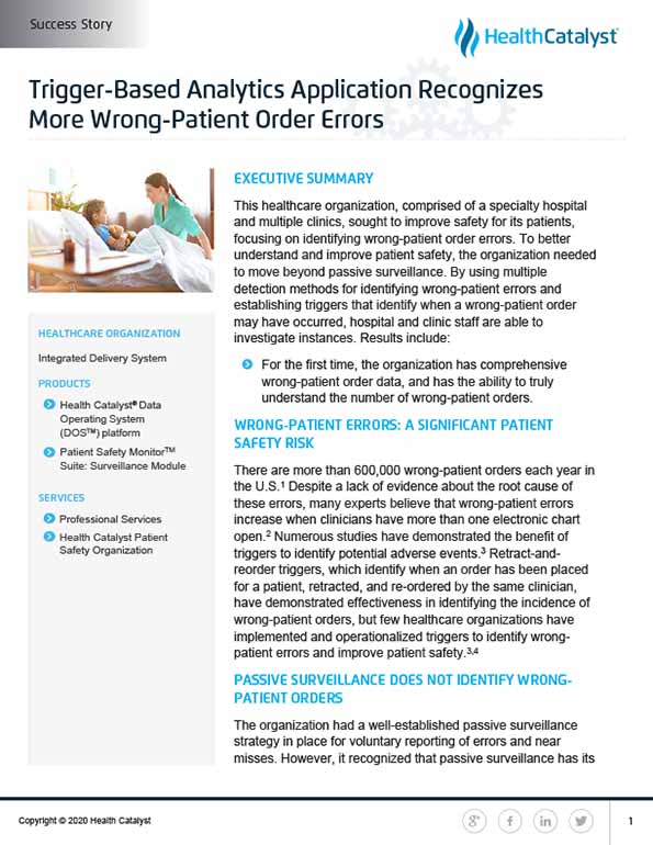 To truly understand prescribing safety, the organization leveraged the Health Catalyst® Data Operating System (DOS™) and a robust suite of analytics applications, including the Patient Safety Monitor™ Suite: Surveillance Module, a trigger-based surveillance system, to monitor, detect, predict, and prevent threats to patient safety before harm can occur.