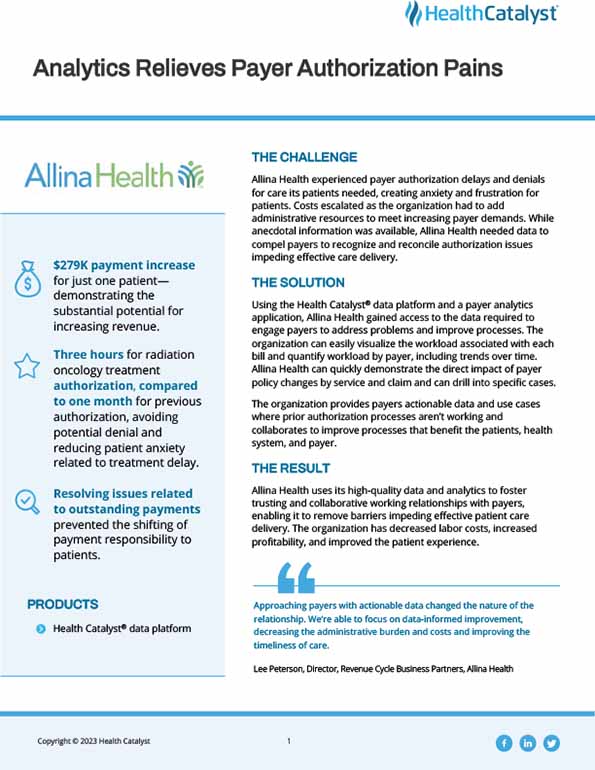 Allina Health faced payer authorization delays affecting patient care. By utilizing the Health Catalyst® data platform, the organization engaged payers to improve processes and build collaborative relationships. This approach led to significant outcomes, including reduced labor costs, increased profitability, and an enhanced patient experience.