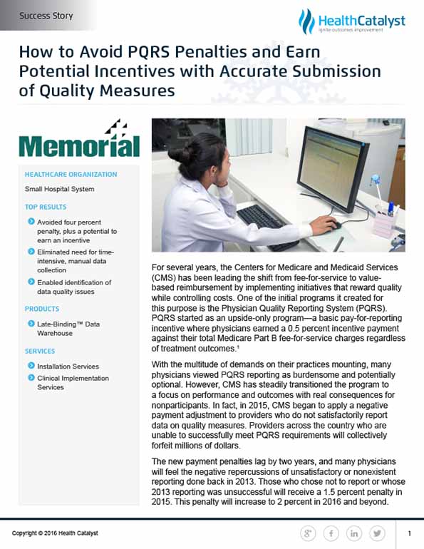 Memorial Hospital faced a significant problem when its PQRS reporting process was hampered by its transition to a new EHR system. Typically, an EHR vendor would provide PQRS metrics data for submission to CMS. However, Memorial learned that their new EHR vendor would be unable to do this for them for the 2014 submission. For Memorial’s group of more than 100 physicians, the bottom line impact per year of a PQRS penalty for not reporting is in the hundreds of thousands of dollars.