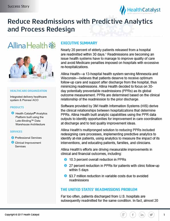 Allina Health’s multipronged solution to reducing PPRs included redesigning care processes, implementing predictive analytics to identify at-risk patients, using analytics to measure the impact of its interventions, and educating patients, families, and clinicians.