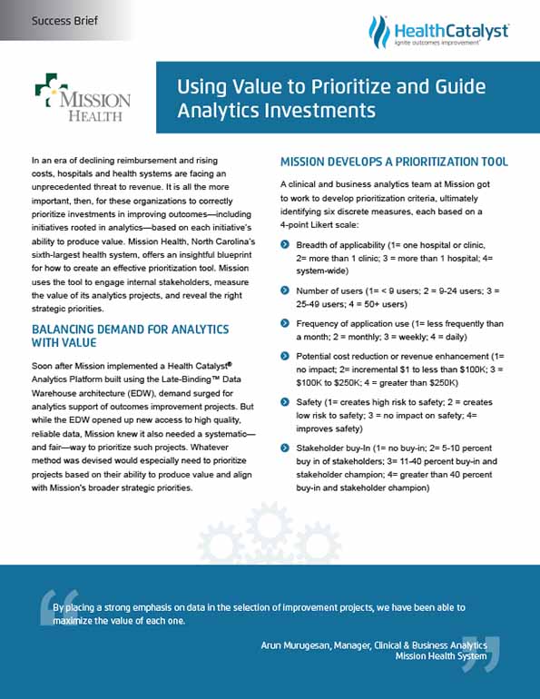 Soon after Mission implemented a Health Catalyst Analytics Platform built using the Late-Binding™ Data Warehouse architecture (EDW), demand surged for analytics support of outcomes improvement projects. But while the EDW opened up new access to high quality, reliable data, Mission knew it also needed a systematic—and fair—way to prioritize such projects. Whatever method was devised would especially need to prioritize projects based on their ability to produce value and align with Mission’s broader strategic priorities.