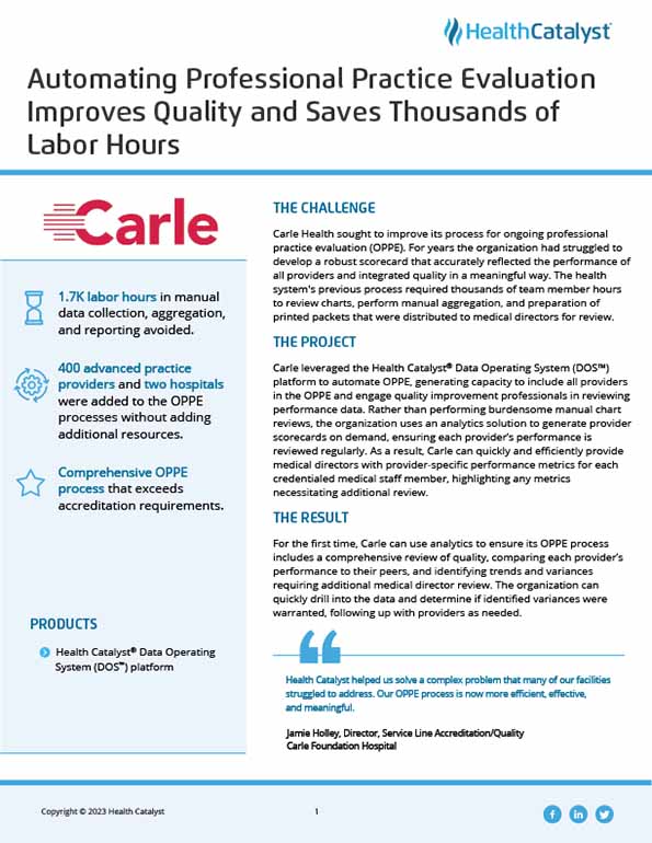Carle leveraged the Health Catalyst® Data Operating System (DOS™) platform to automate OPPE, generating capacity to include all providers in the OPPE and engage quality improvement professionals in reviewing performance data. Rather than performing burdensome manual chart reviews, the organization uses an analytics solution to generate provider scorecards on demand, ensuring each provider’s performance is reviewed regularly. As a result, Carle can quickly and efficiently provide medical directors with provider-specific performance metrics for each credentialed medical staff member, highlighting any metrics necessitating additional review.