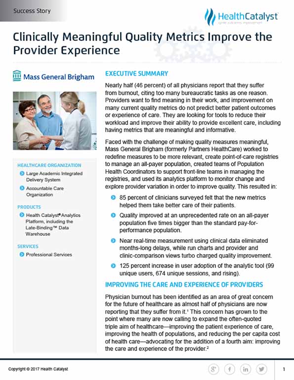 Mass General Brigham is a large, non-profit healthcare system founded by Brigham and Women’s Hospital and Massachusetts General Hospital, and includes community and specialty hospitals, a managed care organization, a physician network with over 6,500 physicians, community health centers, and home care. Mass General Brigham determined that it was time to improve the care and experience of its providers by helping them find meaning and insight from the quality metrics they were being asked to collect.