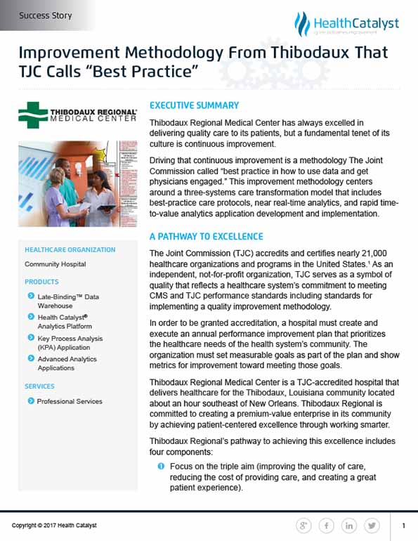 Thibodaux Regional Medical Center prioritizes continuous improvement in patient care. Guided by a methodology recognized by The Joint Commission, the organization employs a three-systems care transformation model that includes best-practice care protocols, near real-time analytics, and rapid implementation of analytics applications to enhance patient outcomes.