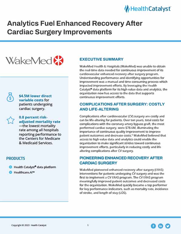 WakeMed Health & Hospitals (WakeMed) was unable to obtain the real-time data needed for continuous improvement of its cardiovascular enhanced recovery after surgery program. Understanding performance and identifying opportunities for improvement was a manual and time-consuming process which impacted improvement efforts. By leveraging the Health Catalyst® data platform for its high-value data and analytics, the organization now has access to the data that supports continuous improvement efforts.