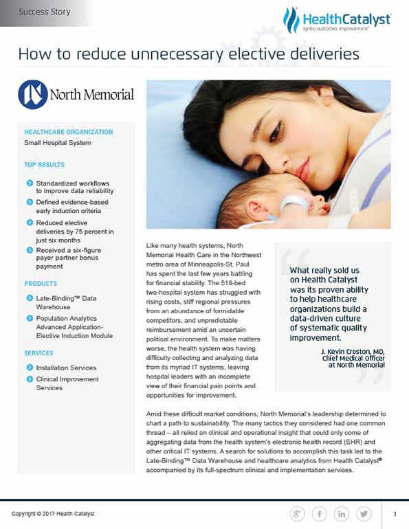 North Memorial’s use of Health Catalyst technology and the team process it put in place reduced the health system’s rate of elective early-term deliveries by 75 percent in just six months. The percentage of all deliveries that were elective pre- 39-week surgeries plummeted from 1.2 percent to just 0.3 percent, shattering the payer’s goal of 0.6 percent and earning North Memorial a six-figure bonus payment.