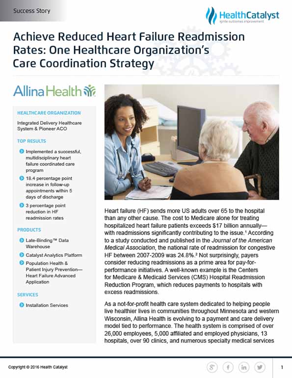 Heart failure (HF) is the leading cause of hospitalizations among adults over 65 in the U.S, costing Medicare over $17 billion annually. To address this challenge, Allina Health implemented a multidisciplinary HF management program with nurse care coordinators and nurse practitioners to enhance patient engagement and ensure coordinated care. Utilizing data from its enterprise data warehouse, Allina has successfully reduced 30-day HF readmission rates.
