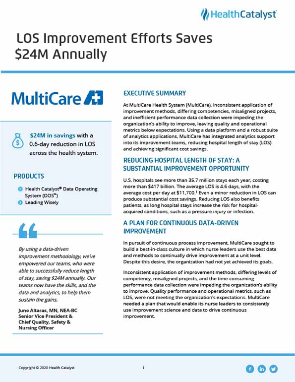 At MultiCare Health System (MultiCare), inconsistent application of improvement methods, differing competencies, misaligned projects, and inefficient performance data collection were impeding the organization’s ability to improve, leaving quality and operational metrics below expectations. Using a data platform and a robust suite of analytics applications, MultiCare has integrated analytics support into its improvement teams, reducing hospital length of stay (LOS), and achieving significant cost savings.