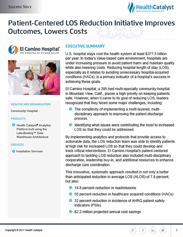 By implementing analytics and protocols that provide access to actionable data, the LOS reduction team was able to identify patients at high risk for increased LOS so that they could develop and track critical interventions. El Camino Hospital’s patient-centered approach to tackling LOS reduction also included multi-disciplinary cooperation, leadership buy-in, and additional resources to enhance discharge care coordination.