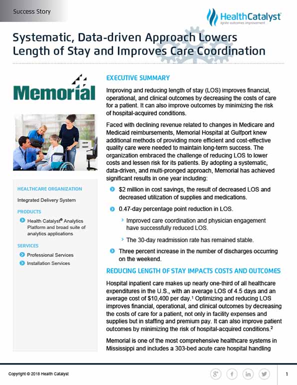 Integrating concepts from the Health Catalyst improvement methodology into its process improvement efforts, and data from the Health Catalyst® Analytics Platform and broad suite of analytics applications, Memorial deployed a systematic set of solutions to significantly decrease LOS.