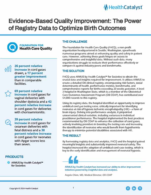 FHCQ uses ARMUS by Health Catalyst™ for Societies to obtain the crucial data and insights required for improvement. It utilizes ARMUS to create a detailed OB clinical registry, encompassing risk factors, social determinants of health, performance metrics, benchmarks, and comprehensive reports for births exceeding 20 weeks gestation. A level 3 hospital in Washington State, which is a member of the Obstetrical Care Outcomes Assessment Program (OB COAP), has contributed over 54,000 records to this registry.
