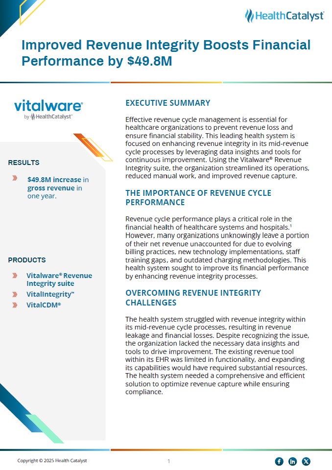Effective revenue cycle management is essential for healthcare organizations to prevent revenue loss and ensure financial stability. This leading health system is focused on enhancing revenue integrity in its mid-revenue cycle processes by leveraging data insights and tools for continuous improvement. Using the Vitalware® Revenue Integrity suite, the organization streamlined its operations, reduced manual work, and improved revenue capture.