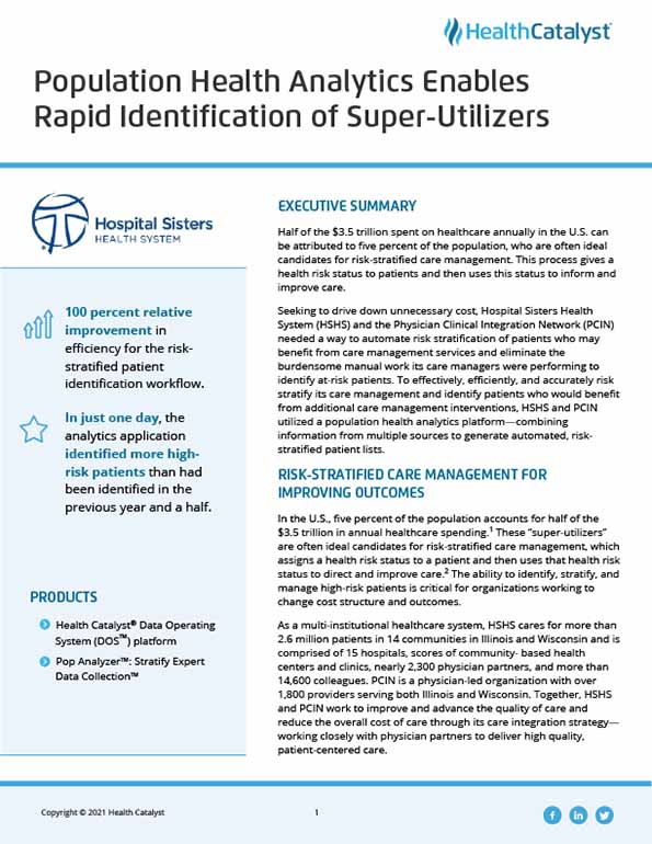 Seeking to drive down unnecessary cost, Hospital Sisters Health System (HSHS) and the Physician Clinical Integration Network (PCIN) needed a way to automate risk stratification of patients who may benefit from care management services and eliminate the burdensome manual work its care managers were performing to identify at-risk patients. To effectively, efficiently, and accurately risk stratify its care management and identify patients who would benefit from additional care management interventions, HSHS and PCIN utilized a population health analytics platform—combining information from multiple sources to generate automated, risk-stratified patient lists.