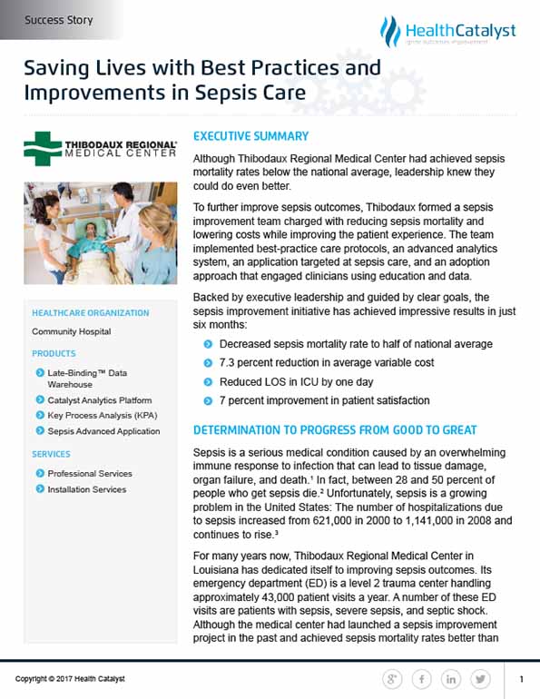 Thibodaux recognized the importance of analytics in convincing clinicians of the need for practice change, as well as in providing the information needed to sustain those practice changes. The team deployed an advanced analytics application for sepsis powered by Health Catalyst to support process improvement efforts, making it possible to see the impact of interventions and to correlate those interventions with patient outcomes. The combination of the improvement methodology with analytics has given Thibodaux the ability to be very responsive and proactive.