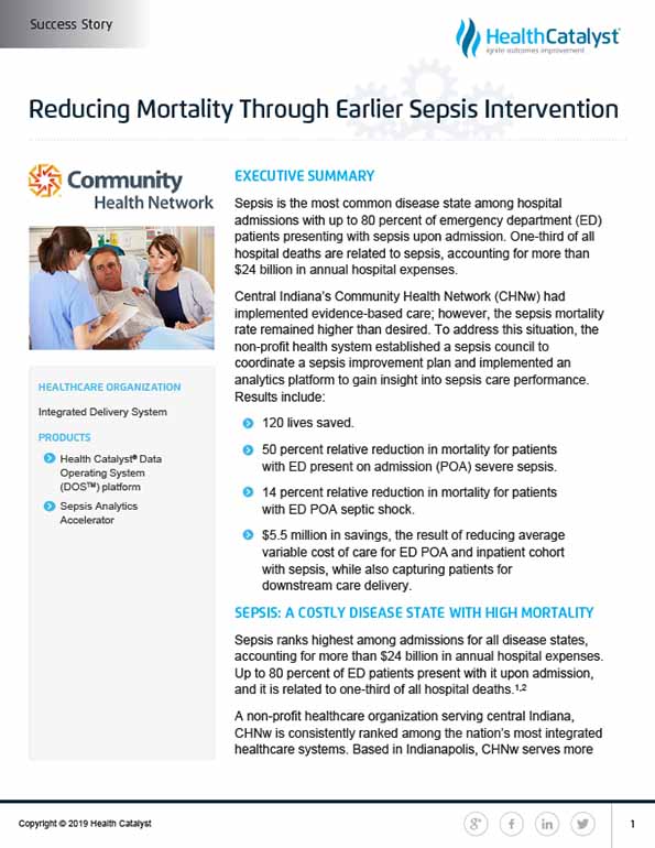 Central Indiana’s Community Health Network (CHNw) had implemented evidence-based care; however, the sepsis mortality rate remained higher than desired. To address this situation, the non-profit health system established a sepsis council to coordinate a sepsis improvement plan and implemented an analytics platform to gain insight into sepsis care performance.