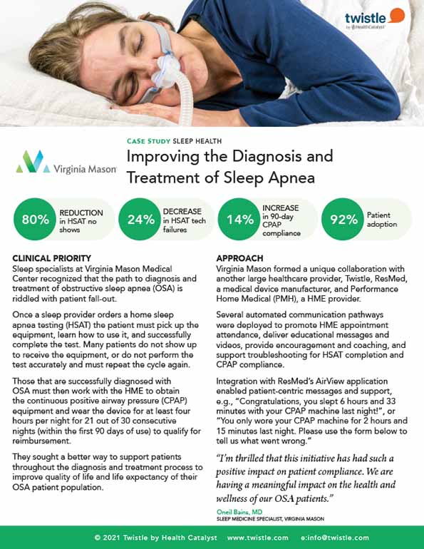 Virginia Mason Medical Center collaborated with Twistle by Health Catalyst, another large healthcare provider, a medical device manufacturer, and an HME provider to deploy automated communication pathways. The pathways promote HME appointment attendance, deliver educational messages and videos, provide encouragement and coaching, and support troubleshooting for HSAT completion and CPAP compliance.