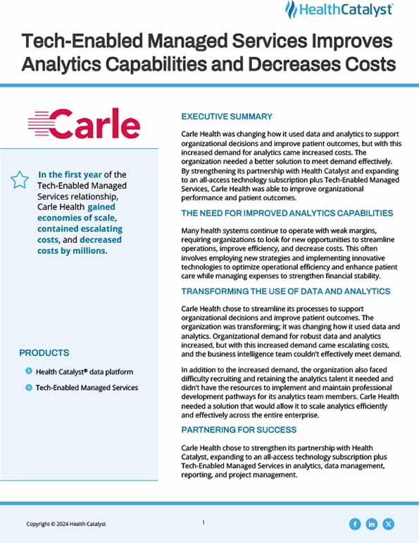 “Health Catalyst’s Tech-Enabled Managed Services has exceeded our expectations. The rigor, standards, and best-practice processes have meaningfully advanced analytics at Carle Health and decreased costs.”