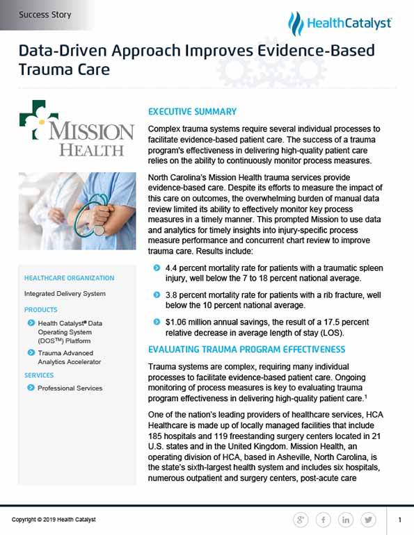 North Carolina’s Mission Health trauma services provide evidence-based care. Despite its efforts to measure the impact of this care on outcomes, the overwhelming burden of manual data review limited its ability to effectively monitor key process measures in a timely manner. This prompted Mission to use data and analytics for timely insights into injury-specific process measure performance and concurrent chart review to improve trauma care.
