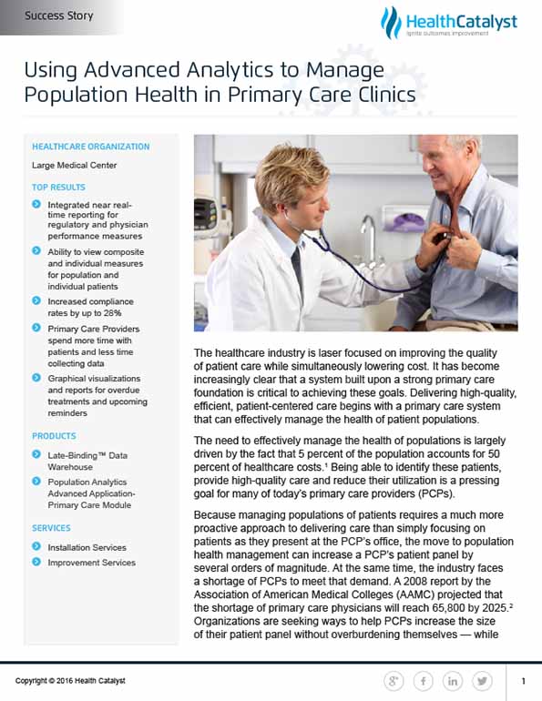 Efficiently managing population health is essential, as 5 percent of patients incur 50 percent of healthcare costs. This healthcare organization utilized an enterprise data warehouse and analytics to identify high-cost patients, enhance care quality, streamline reporting, and enable primary care providers to focus more on patient care rather than data collection.