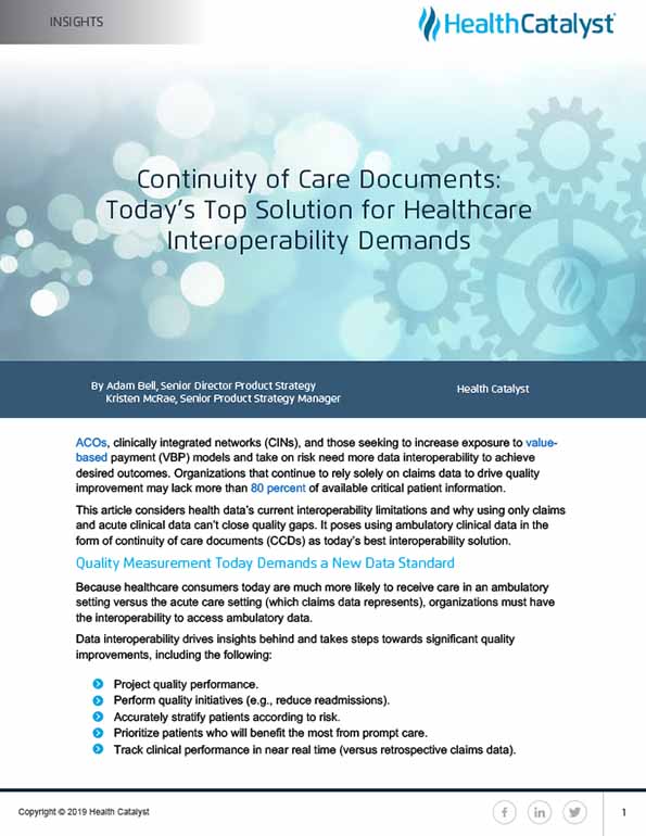 This article considers health data’s current interoperability limitations and why using only claims and acute clinical data can’t close quality gaps. It poses using ambulatory clinical data in the form of continuity of care documents (CCDs) as today’s best interoperability solution.