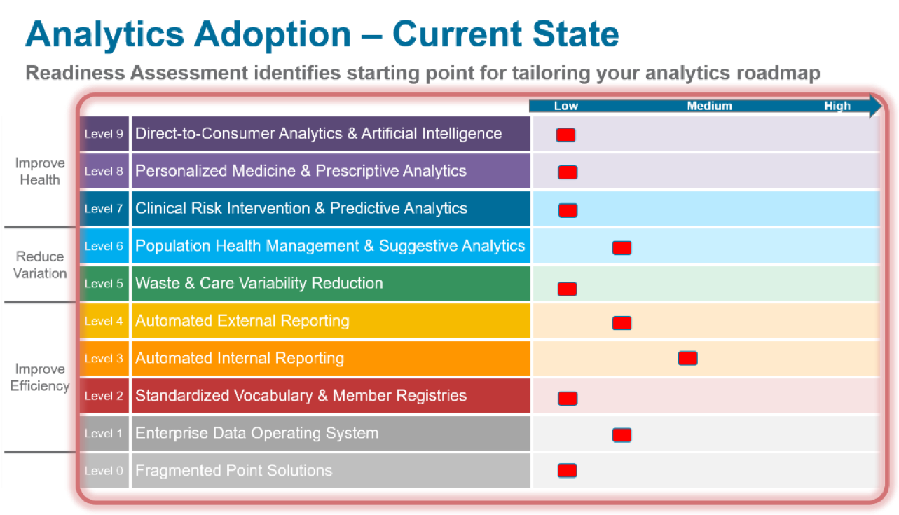 Before adopting and executing an analytics roadmap, a payer organization should complete an analytics readiness assessment. The assessment identifies where an organization falls along the analytics adoption model—where it stands compared to industry standards—and ensures organizational expectations are in line with organizational capabilities.