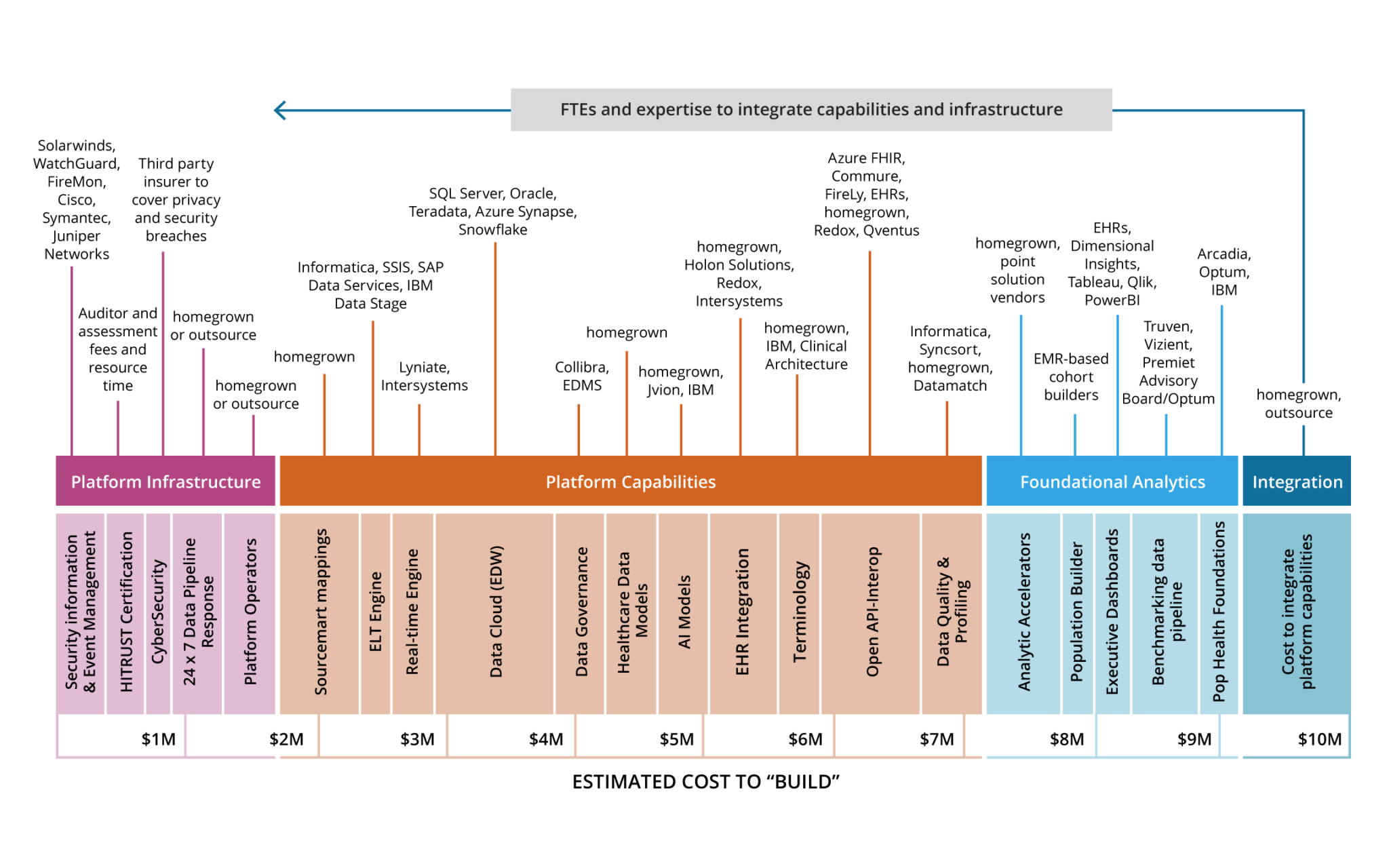Even health systems that use cloud services (e.g., Microsoft Azure) to build data and analytics platforms won’t end up with fully featured solutions, requiring them to license some capabilities (such as platform capabilities and foundational analytics). In this way, the BYO platform is like a do-it-yourself (DIY) home remodel versus renovating with a contractor. The DIY builder pieces together materials and services (often at extra expense), whereas a contractor has access to all needed elements and the skillsets (e.g., architect and interior designer) to ensure the home fits together.