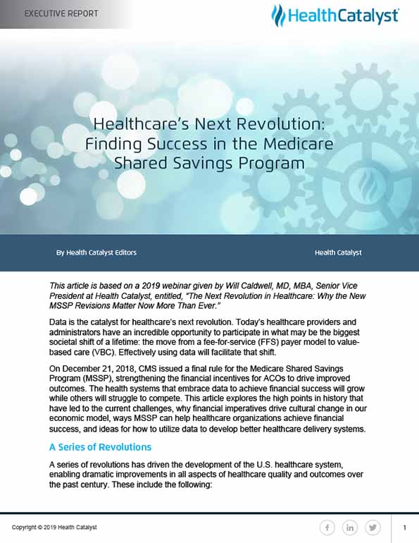 This article is based on a 2019 webinar given by Will Caldwell, MD, MBA, Senior Vice President at Health Catalyst, entitled, “The Next Revolution in Healthcare: Why the New MSSP Revisions Matter Now More Than Ever.”
