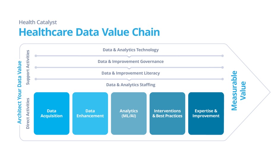 While this article focuses on analytics as a common point of failure in transforming data into measurable value, AI depends on good data. Consequently, Health Catalyst urges health systems to think upstream and downstream from the point of analytics in the data value chain:
