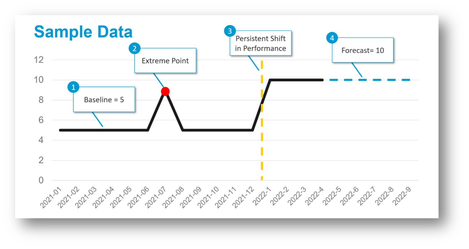 Note that the four points shown in Figure 1 are more difficult to determine in Figure 2. This is the line chart Health Catalyst uses extensively to measure the accuracy of analytic interpretations. Surprisingly, only 4% of analysts, department leaders, and even board members correctly determine all four points: the baseline, extreme points, persistent shifts, and forecast. Unfortunately, misidentifying these four data points can lead to incorrect conclusions and, therefore, negative consequences. Let’s look at each.