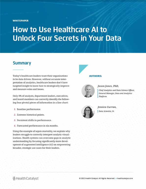 Healthcare leaders committed to making their organizations data driven by optimizing the complete healthcare data value chain can start by taking the analytics interpretation online assessment to understand their capabilities around interpreting analytics outputs. They can also access more knowledge through Health Catalyst thought leadership on AI. Finally, healthcare leaders can contact a Health Catalyst representative to discuss how to optimize the healthcare data value chain to transform more data into more measurable value.