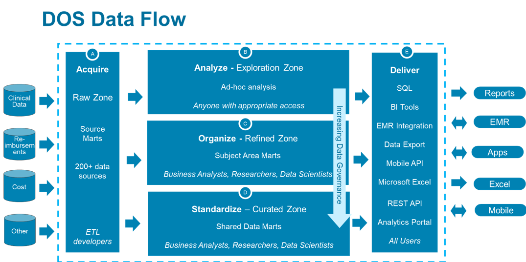 Even with the above benefits, HIE data alone doesn’t support comprehensive improvement under the population health or value-based demands of healthcare today. To meet these modern goals, healthcare organizations must pair these networks with a fully interoperable analytics platform. An optimal modern healthcare data approach combines HIE data with a cloud-based, interoperable analytics platform (e.g., the Health Catalyst® Data Operating System [DOS™], Figure 1, below).